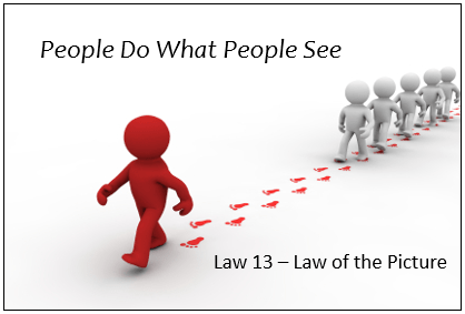 The Law of the Picture is about setting the example. About showing your people how you want them to be and then modeling the way. It is telling me a good leader cannot sit behind a desk and give orders then expect everyone to follow him.